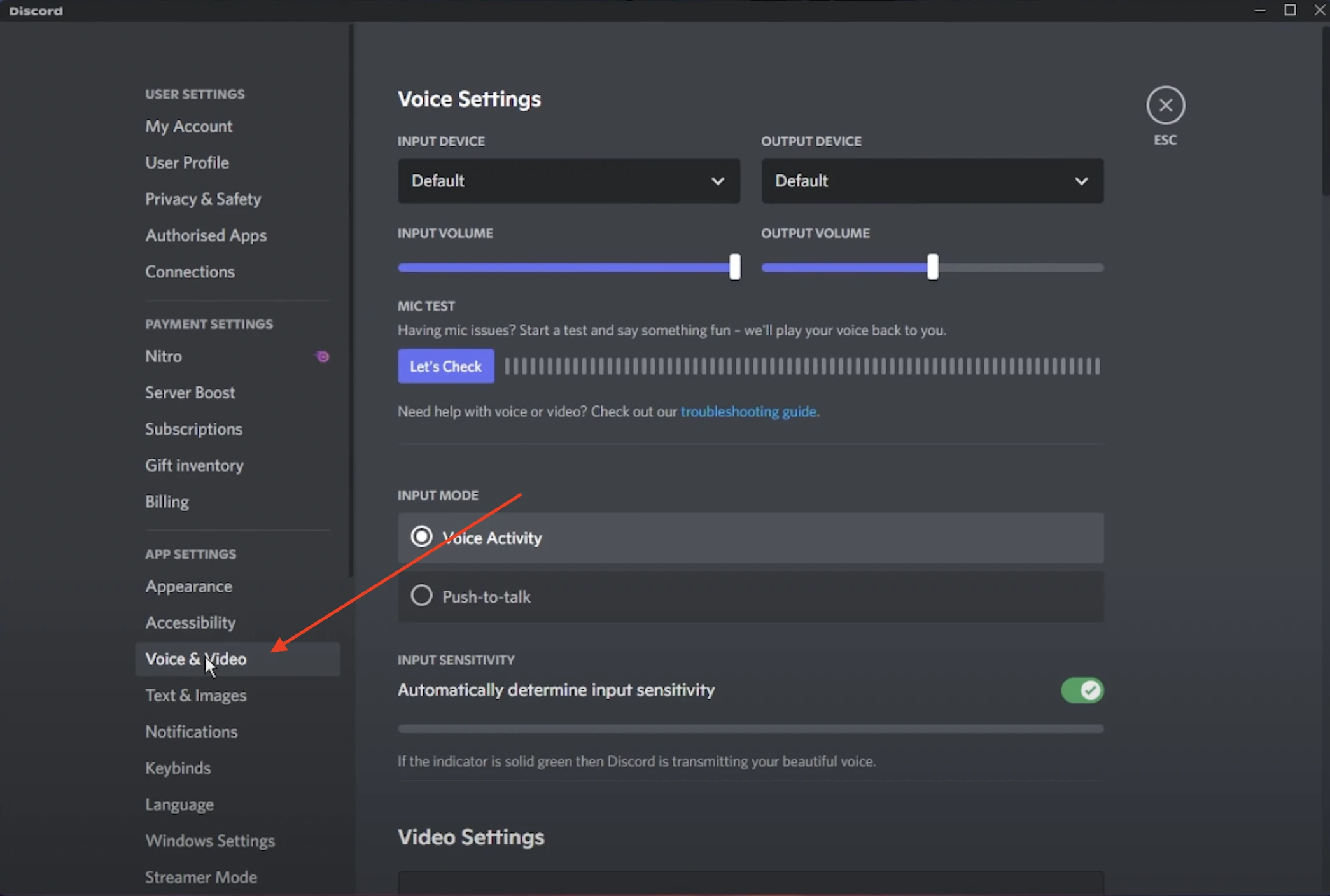 From the menu on the left-hand side, select "Voice & Video" under the "App Settings" section.