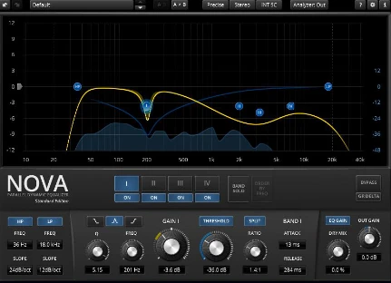 TDR Nova offers transparent compression and advanced metering, making it a versatile tool for precise dynamic control and frequency shaping.
