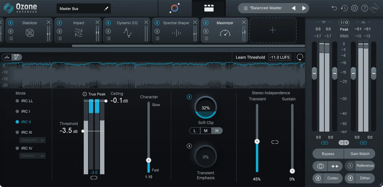 The intelligent Release Control (IRC) IV algorithm in Ozone 10 Maximizer will allow you to produce a smooth and transparent limiting achieved by dynamically adjusting the release time based on the type of input audio signal.