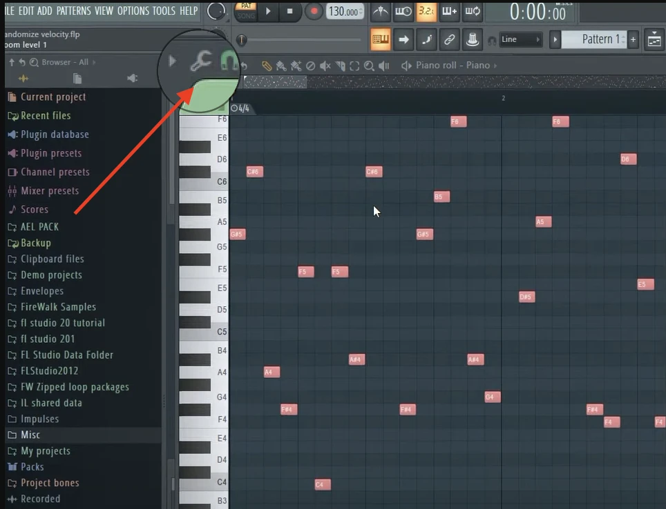 The first and foremost thing you will have to do is select the pattern containing the MIDI data whose velocity you want to randomize. Then open the piano roll by either pressing the F7 button on your keyboard or by clicking the piano roll button on the taskbar.